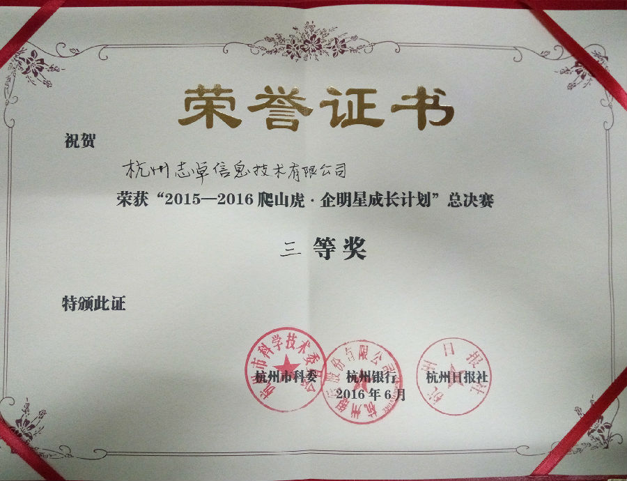 杭州志卓科技股份有限公司的參賽項目——云客網平臺經過近10個月的層層選拔、激烈角逐之后,一路過關斬將,歷經初賽和兩輪晉級賽,從800多家企明星參評企業中脫穎而出。公司副總經理兼云客網項目運營總監鄭小龍代表志卓參加了本次年度總決賽,從技術到產品,從團隊到市場,從運營到管理,云客網項目展現出了較好的創新性和成長性,最終云客網平臺榮膺“2015-2016爬山虎?企明星成長計劃”年度總決賽三等獎。
